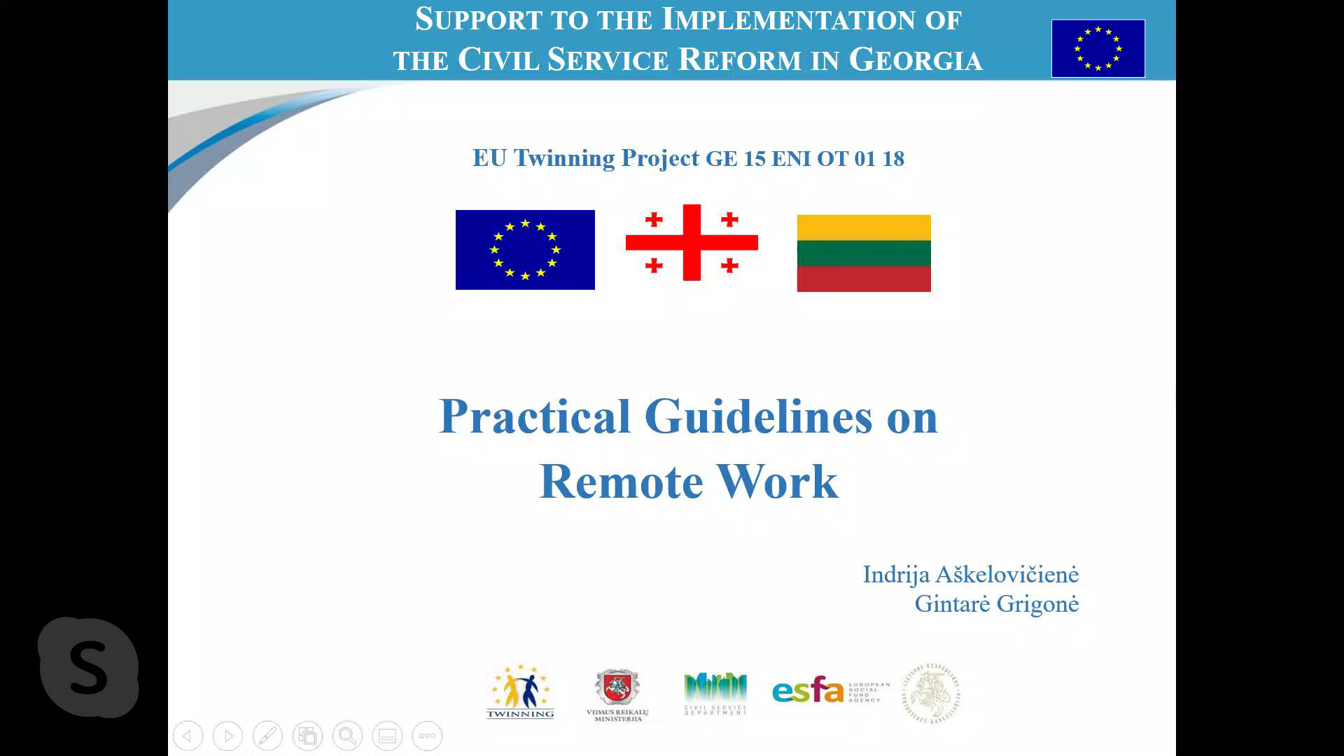 ლიეტუველმა ექსპერტებმა, დისტანციურ რეჟიმში ჩატარებული პრეზენტაციისა და დისკუსიის ფორმატში, თავიანთი ცოდნა და გამოცდილება გაუზიარეს საჯარო სამსახურის ბიუროს მენეჯმენტს საჯარო სამსახურში დისტანციურ მუშაობასა და შესაბამისი პლატფორმების ეფექტურ გამოყენებასთან დაკავშირებულ საკითხებზე. კერძოდ, ექსპერტებმა ისაუბრეს დისტანციური მუშაობის ძირითად პრინციპებზე, მის დადებით და უარყოფით მხარეებზე, მასთან დაკავშირებულ გამოწვევებზე, ასევე, სამართლებრივი რეგულირების საკითხებზე, ტექნიკურ შესაძლებლობებსა და ინფორმაციული უსაფრთხოების პროცედურებზე.