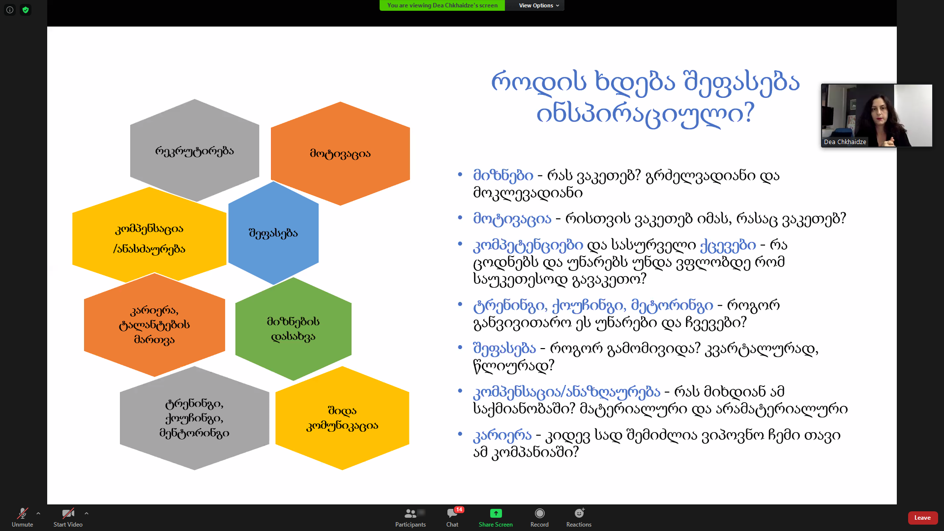 ფორუმის მომხსენებელმა მსმენელებს გააცნო შეფასების სისტემის საფუძვლები და მისი არსი. მან ისაუბრა შეფასების სისტემის ეფექტურ სიხშირეებზე, მის მიზნებსა და შეფასების პროცესში კომუნიკაციისა და უკუკავშირის აუცილებლობაზე. დეა ჩხაიძემ ყურადღება გაამახვილა ადამიანის ფიზიოლოგიურ მხარეებზეც და იმ შედეგებზე, რომელიც შეიძლება თან ახლდეს სამუშაო პროცესს. ამ მხრივ მან ხაზი გაუსვა თანამშრომლის წახალისების აუცილებლობას, რომლის ერთ–ერთი მთავარი ინსტრუმენტიც და ინსპირაციაც სწორედ შეფასების სისტემა შეიძლება წარმოადგენდეს.